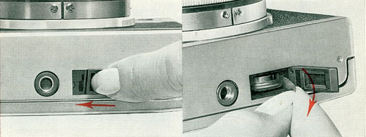 Rebobinage du film: Effectué au moyen du bouton de rebobinage situé en-dessous de l'appareil. Rebobinage à manivelle.